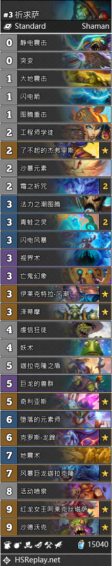 RaFaEl取得大师巡回赛资格的祈求萨,一套伪宇宙体系的萨满,只有霜之祈咒和青蛙之灵是重复卡,理论上摸到青蛙之灵就可以保证剩余卡牌不重复。采用了闪电风暴、杰弗里斯和地震术来处理场面,奇利亚斯和活动喷泉来保证血量,不足之处是减半的祈求牌很难保证迦拉克隆的满祈求变身。非宇宙体系的蛙灵祈求萨有几个方向,一种是满编突变/图腾重击来构筑法术链,另一种是静电震击/流电爆裂/大地之力来构筑法术链。
