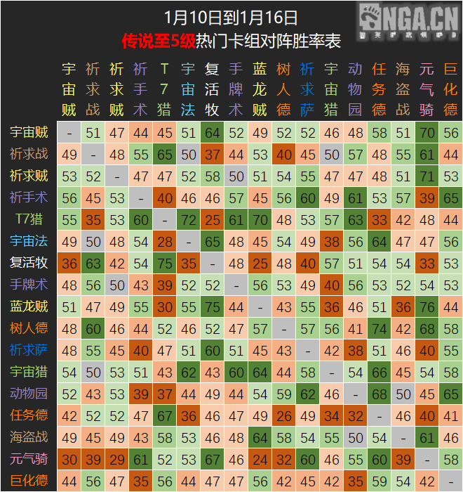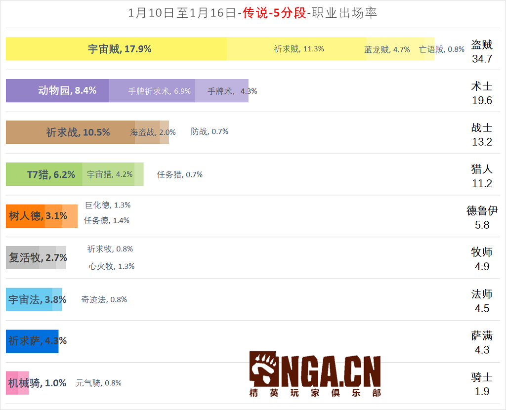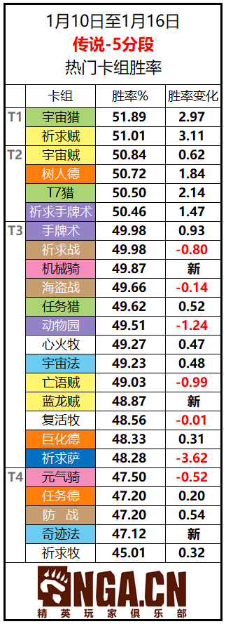 本期NGA国服周报的Tiers List分级为:T1:宇宙猎、祈求贼T2:宇宙贼、树人德、T7猎、祈求手牌术T3:手牌术、祈求战、机械骑、海盗战、任务猎、动物园、心火牧、宇宙法、亡语贼、蓝龙贼、复活牧、巨化德、祈求萨T4:元气骑、任务德、防战、奇迹法、祈求牧