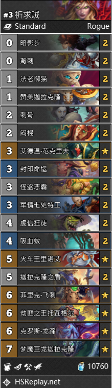 炉石传说的凤凰年来临之后,由于卡池的变化比较大,所以也是出现了很多新卡组,对盗贼来说,祈求的相关组合还是比较强势的,同时在新版本也是加入了奥秘和潜行等体系,强度就更高了,之前也给大家介绍了奥秘祈求贼,这里我们再来看看潜行祈求贼吧。