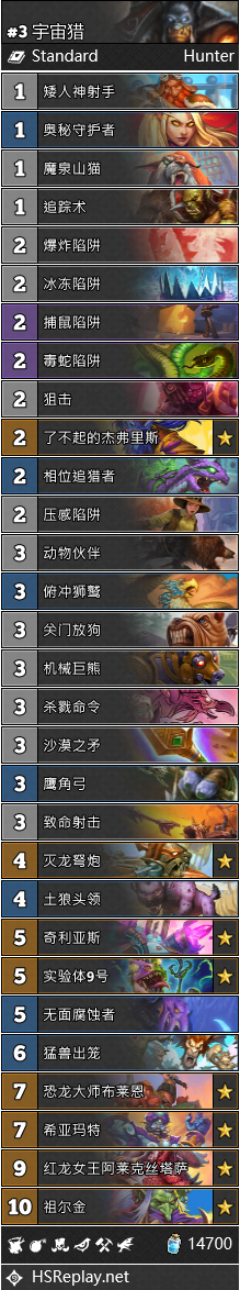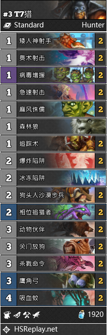 T7猎的构筑倒是一直以来都没有太大的变化,毕竟“打脸”相关的单卡选择在今日的卡池内已经很有限了。只是有部分构筑选择了飞刀杂耍者或灼光战斗法师等低费随从来加强场面能力。它的主要优势对局除了一些慢速卡组外就是当前最主流的几种盗贼,这也是它能稳定存在于天梯和比赛环境中的原因。