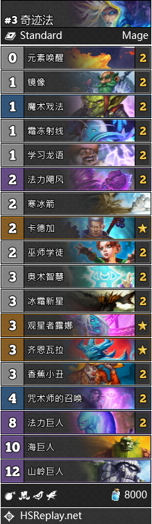 本周奇迹法没有太大变化,值得注意的是奇迹法多了祈求手牌术这个棘手的对局,本身就是靠几波超展开来踢死对手,偏偏祈求术的灾祸异常克制这个对局,而奇迹法的资源量并不足以和术士打消耗。巫师学徒和法力飓风的一波节奏爆发,以及法力巨人的展开,是对抗盗贼的最大资本。
