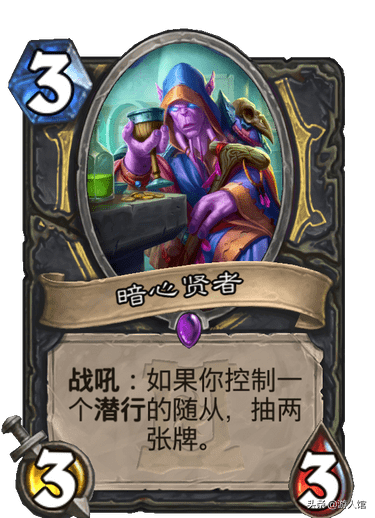 既然有一个潜行体系,光靠1张卡肯定是不行的,除了间谍女郎之外,空中私掠者和暗心贤者也是体系中的配合卡,他们都和过牌相关,虽然我们卡组中的跟班不少,但要抽牌库中的卡牌还是要靠他们,在盗贼卡组中,手牌资源也是很重要的,无论是连击还是造超级大范都需要他们嘛。
