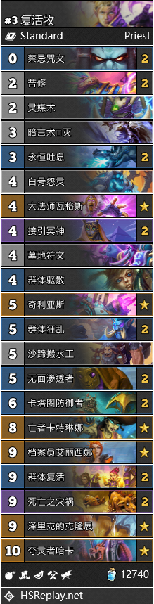 牧师的出场率依然不足5%,但牧师唯一主流形态——复活牧表现还不差。另外牧神也为我们带来了OTK牧,但根据最新的统计其胜率不足40%,因此我们决定暂且观望。