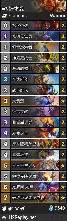 这里分享的是Glory的版本,祈求战的构筑基本稳定下来,不同玩家在这个框架下会进行一些微调,携带狂暴/暴乱狂战士可以打得更有进攻性,但暴乱狂战士在目前环境下并不算一个难处理的生物。也有携带怪盗军需官补充曲线的版本。对盗贼深恶痛绝的玩家可以考虑尝试携带战路/发条地精/圣剑扳手/乱斗的版本,在5-传说分段还是可以让宇宙贼相当头疼的。