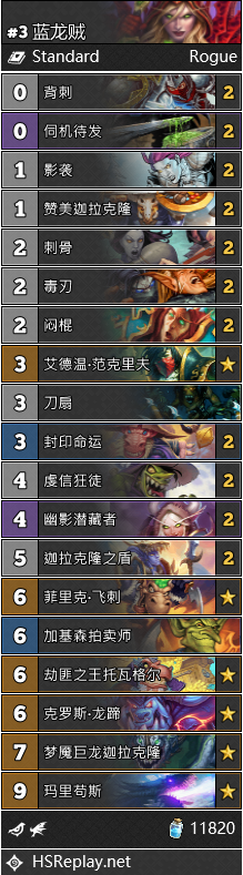 盗贼迦拉克隆体系另外的一个很好的配合对象,就是玛里苟斯。梦魇巨龙迦拉克隆战吼的减费效果、跟班配合国王的奇迹之杖,乃至幽影潜藏者提供的硬币,都可以很好地发动蓝龙体系的斩杀。另外,这套卡组创意性地携带了一张加基森拍卖师,以更好地利用多余的低费法术以及硬币,是一种异于主流但非常不错的思路。