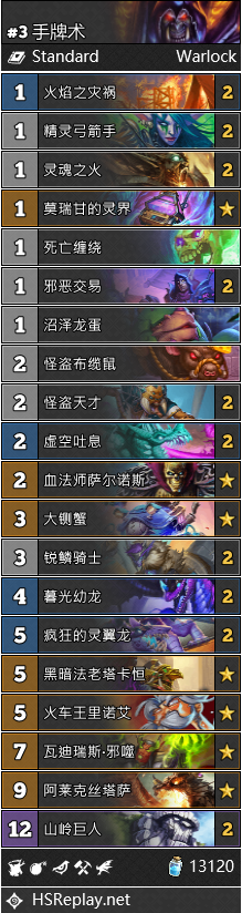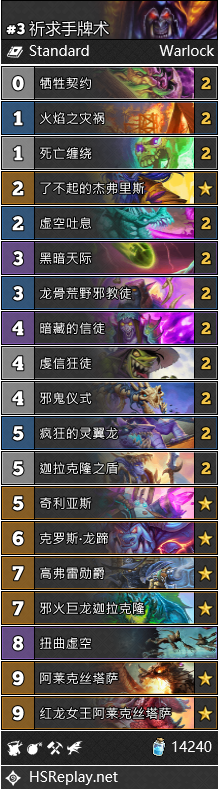 削弱补丁的到来反而催生了术士的火爆,可以说是因祸得福。一方面是邪鬼仪式的削弱不足以伤筋动骨,只是让动物园腾出了1-2个卡位;另一方面是祈求体系的手牌术少了很多天敌,迅速在国服流行起来。祈求手牌术的卡组原型比较有趣,兼顾节奏和控场能力,能够很好地对抗宇宙贼。随着使用人数的不断上升,和优化对抗猎人的表现,这个卡组有可能会重塑天梯环境。
