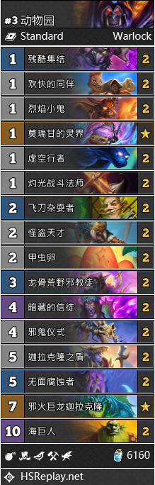动物园是本次补丁术士职业中损失最惨重的一家,对于快攻而言,buff+铺场的费用提高真是要了老命了,动物园的地位因此可以说是下滑了不小;但动物园再弱也是快攻,而且操作也比其他卡组简单,因此反而成为最热门的术士卡组也就不稀奇了。虽然不如以前风光,但动物园的老底还在,很多父子局依然是父子局。但是我们也该看到,JK体系的加入仅仅为这个薄暮老人续了一口气,还是挡不住它老去的步伐,圆缺几时休?