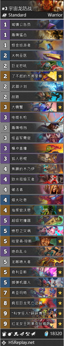 一方面是废墟之子的削弱使祈求战的节奏明显受到影响,另一方面是原本稀少的劣势对局的增多使得战士雪上加霜。节奏型的战士很难保证从盗贼手中拿到场面,哪怕一时拿到了场面也容易被盗贼的一波节奏爆发给打崩。本周最值得关注的是小米锅巴(曾在加基森版本拯救过防战的玩家)构筑并传播到外服的宇宙龙防战。伴随着阵阵巨龙的怒吼,砰砰博士告诉大家英雄牌并不是只有迦拉克隆。
