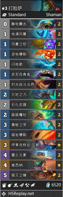 不少玩家采用这个版本的打脸萨取得了印尼站的资格,原型是Norwis的过载快攻萨。理想的运作方式是武器控场、法术膨胀场面最后直伤带走,但这个套牌的构成方式使得它的手札事故很常见。过载体系的构成需要做好数个回合的水晶规划,缺乏猎人般的稳定直伤也需要计算好每一点伤害量,经常胜负就是毫厘之差。此外还有携带鱼人木乃伊/下水道渔人的版本,国服常见的还有携带猎风巨龙增加爆发的版本。