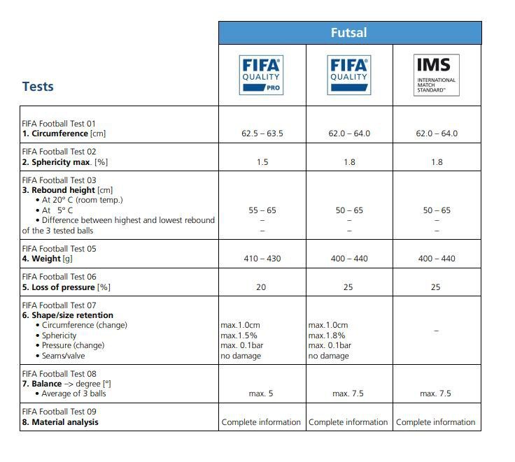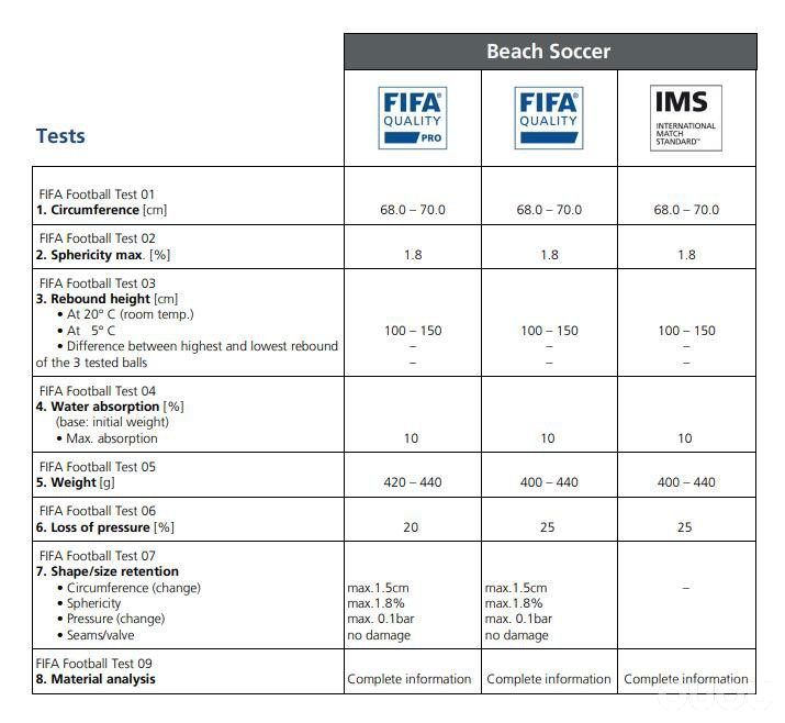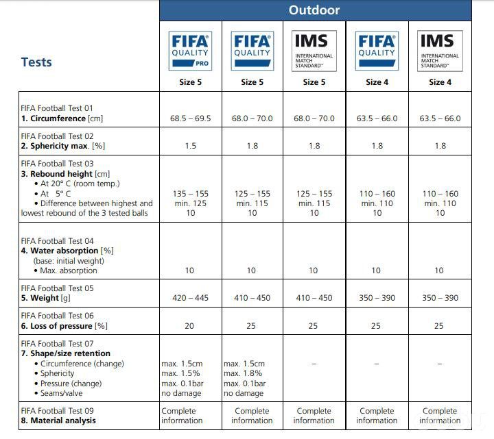这种测试项目的数据全部反映在上面的图中,大家可以在里面找到对应的答案,不一个个去说了。目前FIFA认证的足球只包括了5号和4号球,其余的球不包括在内。更详细的一些测试内容和里面具体对数值的要求感兴趣的可以到FIFA官网看,不过是英文生肉,不过大概意思能看懂。https://football-technology.fifa.com/media/1024/footballs_testing_manual_2015.pdf