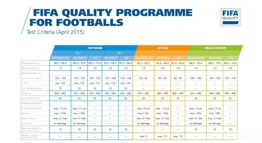 一个足球必须顺利通过国际足联认证的一套体系中的7个测试才能获得FIFA QUALITY标志。测试内容包括球的重量,周长,圆度,反弹高度,吸水率,气密性以及在压力下圆周体对圆形形状和尺寸保持力。