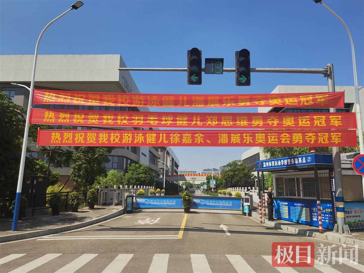 温州体育运动学校门口悬挂的三名奥运冠军夺冠横幅(记者拍摄)