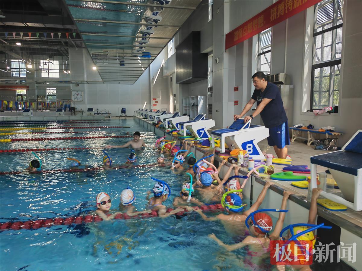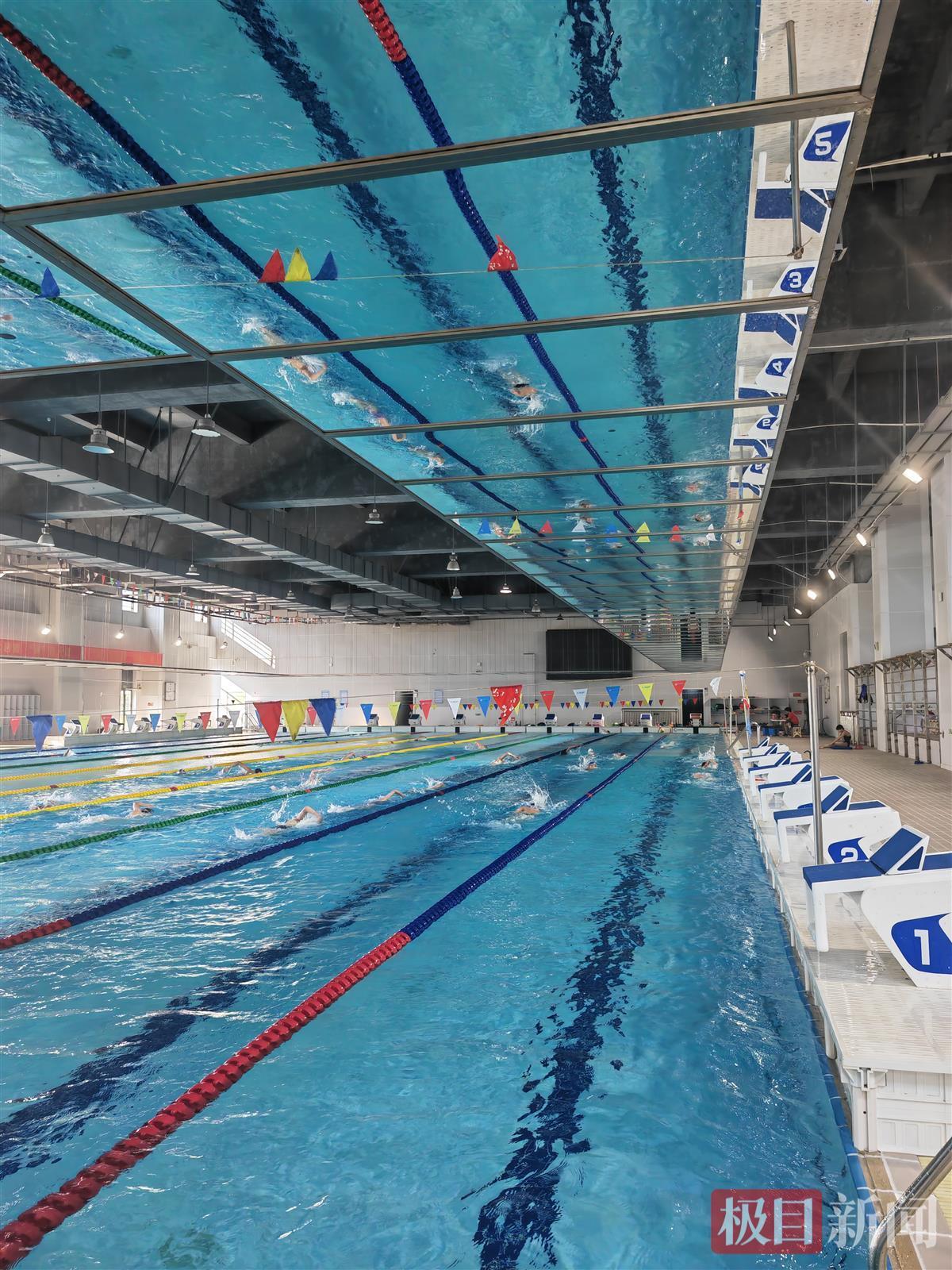 正在进行训练的小队员,泳池上方还有专门用来练习仰泳的镜子(记者拍摄)