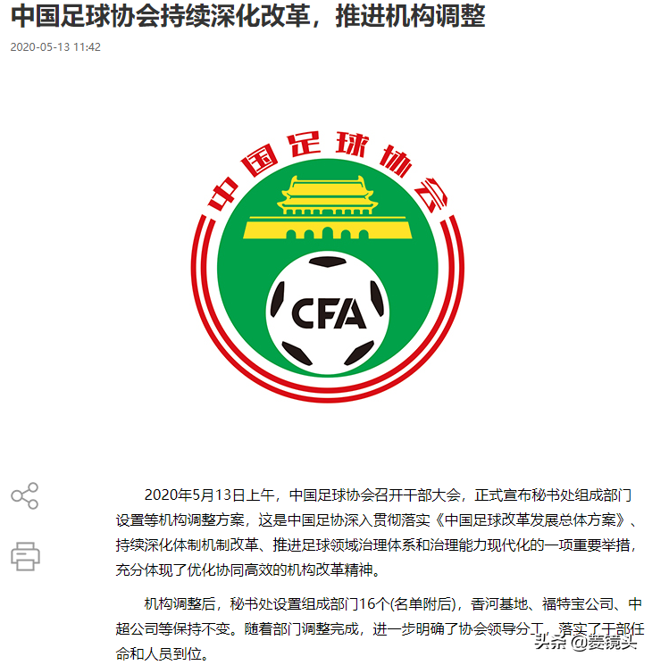 2020年5月13日上午,中国足球协会召开干部大会,正式宣布秘书处组成部门设置等机构调整方案,这是中国足协深入贯彻落实《中国足球改革发展总体方案》、持续深化体制机制改革、推进足球领域治理体系和治理能力现代化的一项重要举措,充分体现了优化协同高效的机构改革精神。