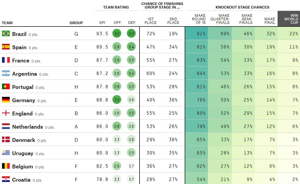 巴西以22%的概率遥遥领先,西班牙11%第二,卫冕冠军法国9%第三,阿根廷、葡萄牙均为8%。