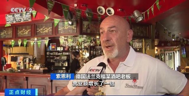 德国法兰克福某酒吧老板 索恩利:我们迎来了非常多外国客人,营业额增长了一倍,很多客人来这里看球赛,而更多的是球赛结束后来庆祝的球迷,几乎每个晚上都爆满。