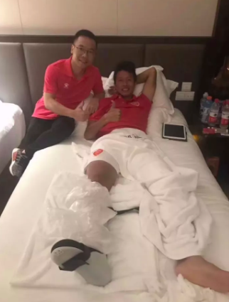从曝光的照片来看,潘佳的骨折情况相当严重,胫骨和腓骨双双断成了两截,看起来相当吓人。但潘佳却相当坚强,在救护车上还笑着和工作人员打招呼,是不折不扣的铁汉。潘佳曾经是前国奥队球员,长期在广东本地球队效力。