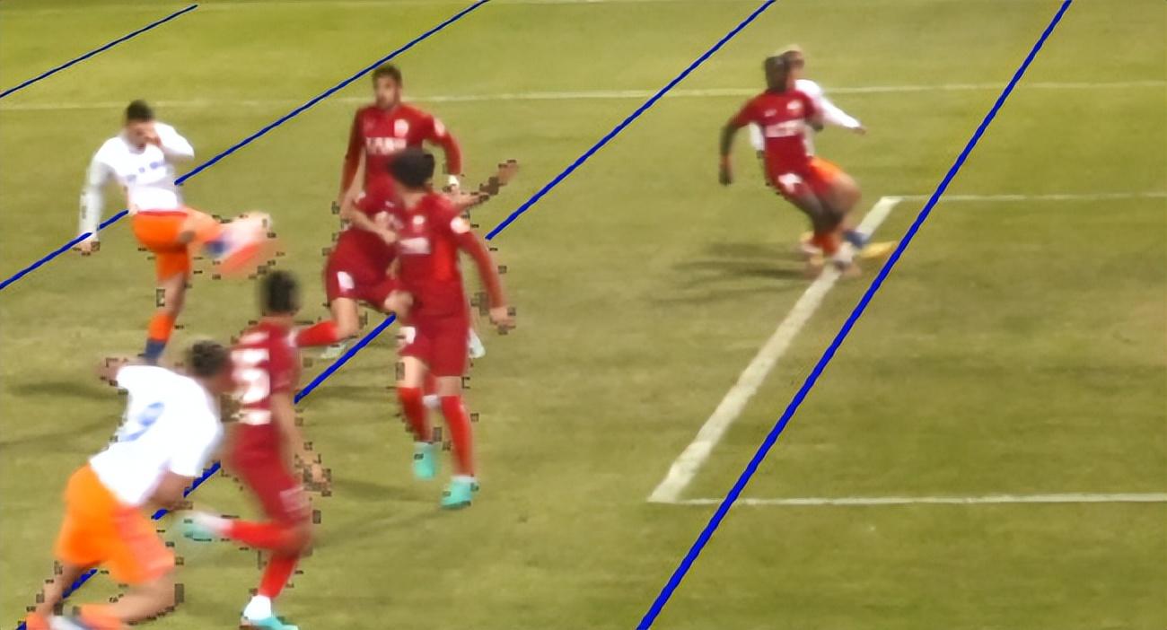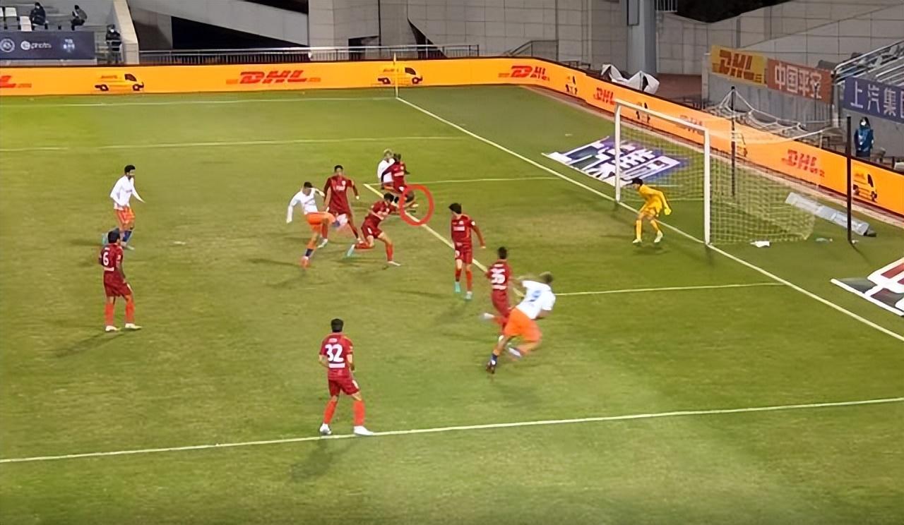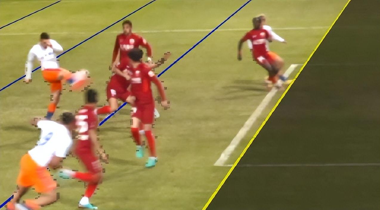 正常来说,看直播的球迷肯定没有VAR划线准,但当时转播镜头一直没有给出一个划线镜头,或者一个更直观角度的定格镜头,强行制造了这一次争议,把主裁判和VAR往坑里推。当然,如果特别细心看当时的转播镜头,也勉强能看到陈蒲的黄色球鞋稍微越位一点点(红色圈)。