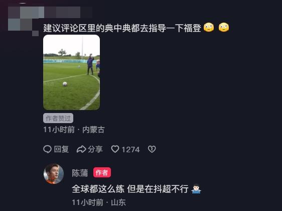 陈蒲回应:“说停球的你们猜猜地上那个框是干嘛用的”、“全球都这么练,但是在抖超不行。”