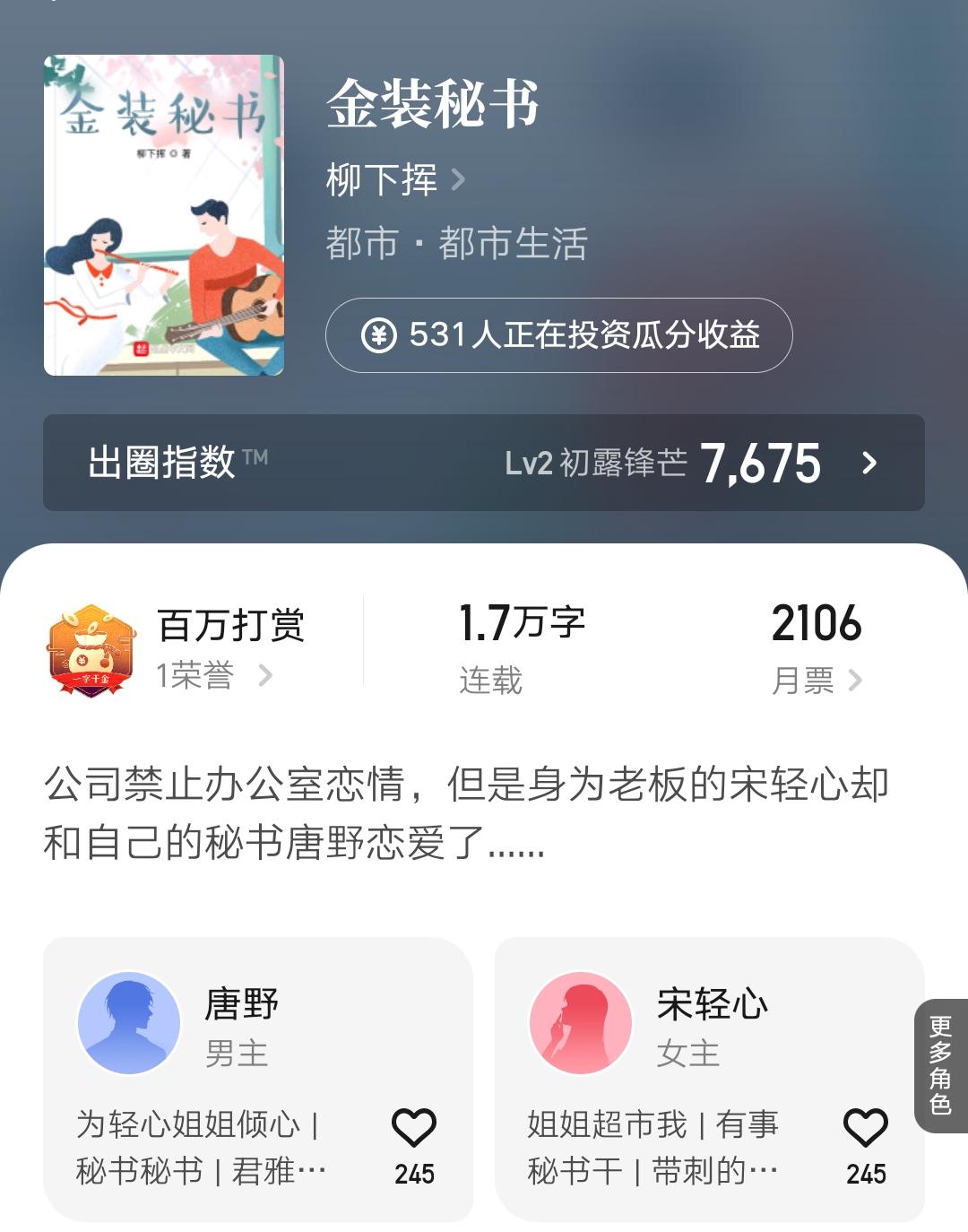 柳下挥在本周开启了新的职场恋爱文《金装秘书》,讲述了一个大酒店集团的全能男秘书和他那霸道女总裁的恋爱故事。小说属于《同桌凶猛》的后传,陈述等人未来也会在新书中有所亮相。