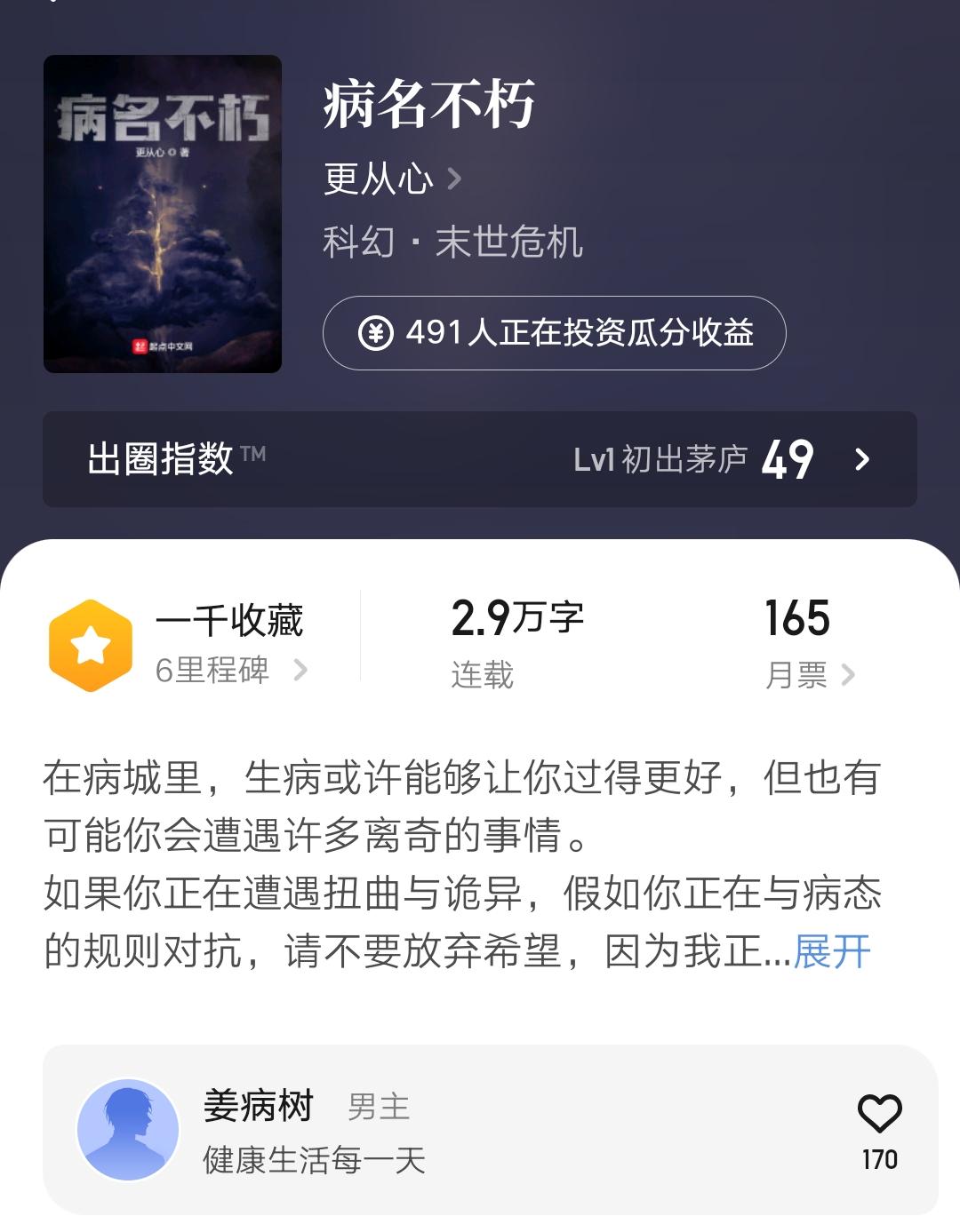 ①第一位:更从心。去年的起点十二天王成员,成名作《末日拼图游戏》,完结时均订一万四。新书《病名不朽》继续走惊悚路线,各种小众元素混搭,估计会对诡异向读者的胃口。