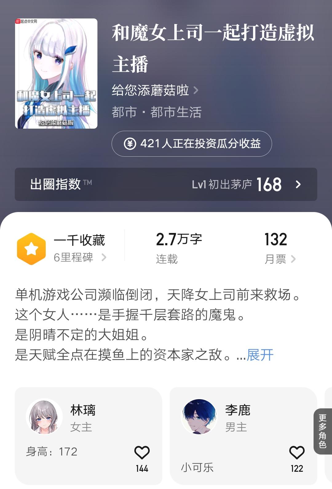 ④第四位:给您添蘑菇啦。写过万订学霸类恋爱文《学魔养成系统》。本身属于灵感型作者,作品短小精悍,经常跑路,让读者又爱又恨。新书《和魔女上司一起打造虚拟主播》,写起了二次元类型的主播文了。