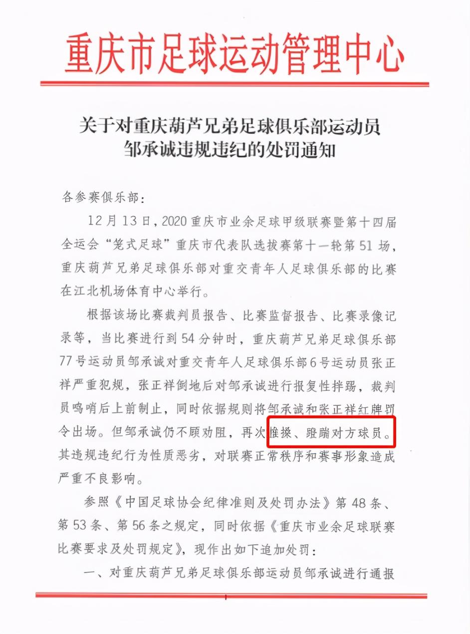 对此,重庆市足球管理中心也是做出了决定,宣布邹承诚禁赛2年的同时,所属俱乐部也要被罚款3千元。