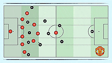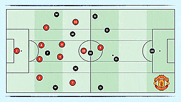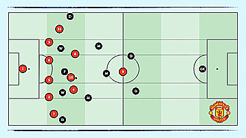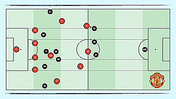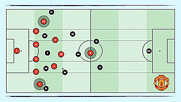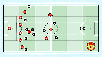 在曼联,边后卫会保持狭窄,在对方边锋向内移动时保护内侧通道,对方边后卫的套边插上有曼联的边锋负责跟随。中场三人组随后变平,紧凑,覆盖任何进入前场的中路通道。