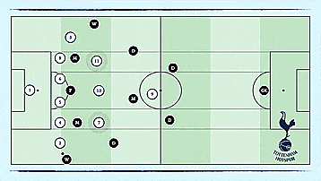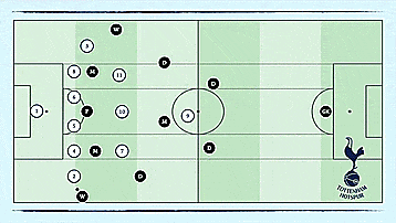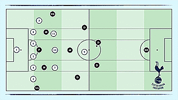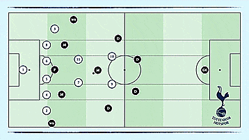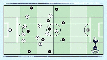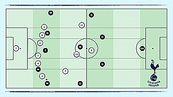 随着内线通道的覆盖,热刺有足够的防守紧凑性,可以长时间的低位防守。9号仍然像以前一样,在重获球权时非常孤立。
