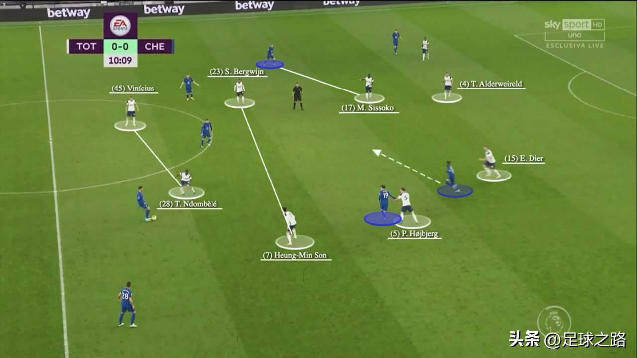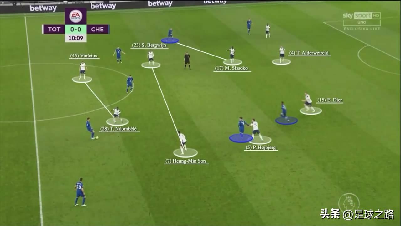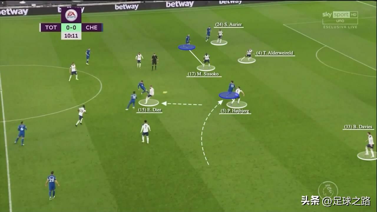 在主场对阵切尔西的比赛中,热刺未能创造出相应的紧凑性,六人后防线前的2-2阵型并没有成功限制对手。下面霍伊别尔和西索科跟踪边路攻击手的移动,中卫戴尔被切尔西中锋带出。