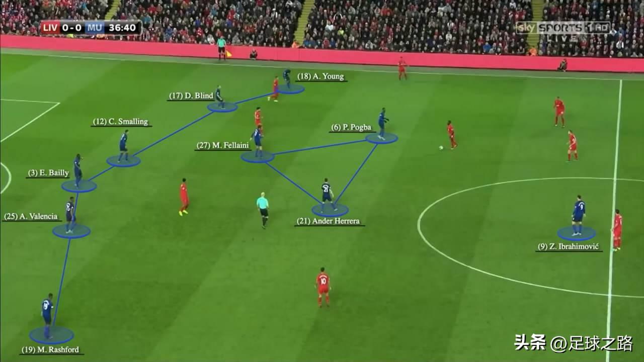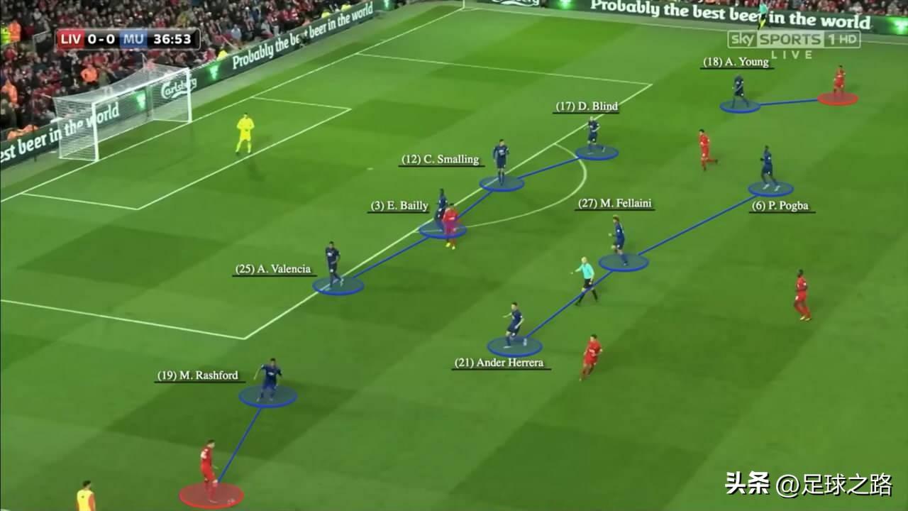 这是形成后防六人组的第一种方法,在客场对阵利物浦就可以看到这样的行动,边锋阿什利-扬和拉什福德一路后退,形成了六人的后防线,博格巴和埃雷拉准备和费莱尼一起并肩作战,组成中场三人组,覆盖在后防六人之前。