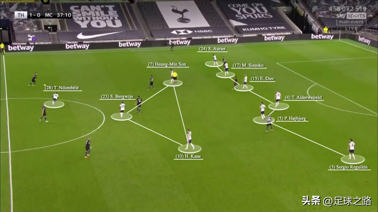 下面是热刺主场对曼城的比赛中,西索科和霍伊别尔作为双后腰已经回撤到后防线,他们在边后卫和中后卫之间,而不是在边后卫的外围提供保护。