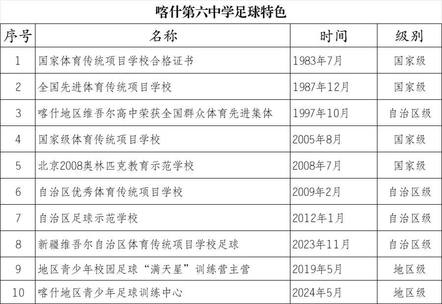 自加挂“上海师范大学附属喀什实验中学”校牌,并成为上海援疆教育集团“1+4+N”集团化办学的核心学校,这5年来六中乔迁建筑面积10万平方米的新校区,班班有球队,定期踢联赛,在全国足球特色学校的发展之路上“越踢越好”。新学年,在自治区教育厅、喀什地区教育局大力支持下,学校面向全疆招收高一年级足球特长生50人,面向喀什地区招收初一年级足球特长生30人,建成梯级校园足球队,并组建了两支梯级女子足球队。