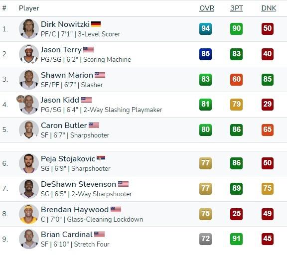 其中,2010-11赛季的小牛队(现独行侠)也被纳入为经典球队,其中诺维茨基以94居首,特里以85排名第二,马里昂以83排名第三,基德以81位列第四。