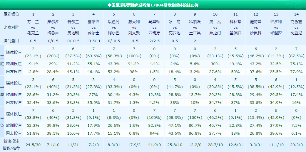 本期足彩包含着世预赛和巴西甲,稳胆选择不多,意大利、西班牙和土耳其可以作为稳胆,冰岛主场难赢克罗地亚,但是需防平。塞尔维亚主场面对威尔士的比赛分歧较大,大单建议全包。
