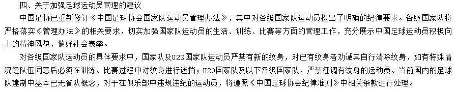 其中,在“关于加强足球运动员管理的建议”,国家体育总局提到:“中国足协已重新修订《中国足球协会国家队运动员管理办法》,其中对各级国家队运动员提出了明确的纪律要求。对各级国家队运动员的具体要求中,国家队及U23国家队运动员严禁有新的纹身,对已有纹身者劝诫其自行清除纹身 ,如有特殊情况经队伍同意后必须在训练、比赛过程中对纹身进行遮挡; U20国家队及以下各级国家队,严禁征调有纹身的运动员 。”