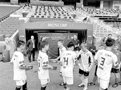 中国校园足球小将在俄罗斯世界杯期间与外国青少年选手交流。资料图片