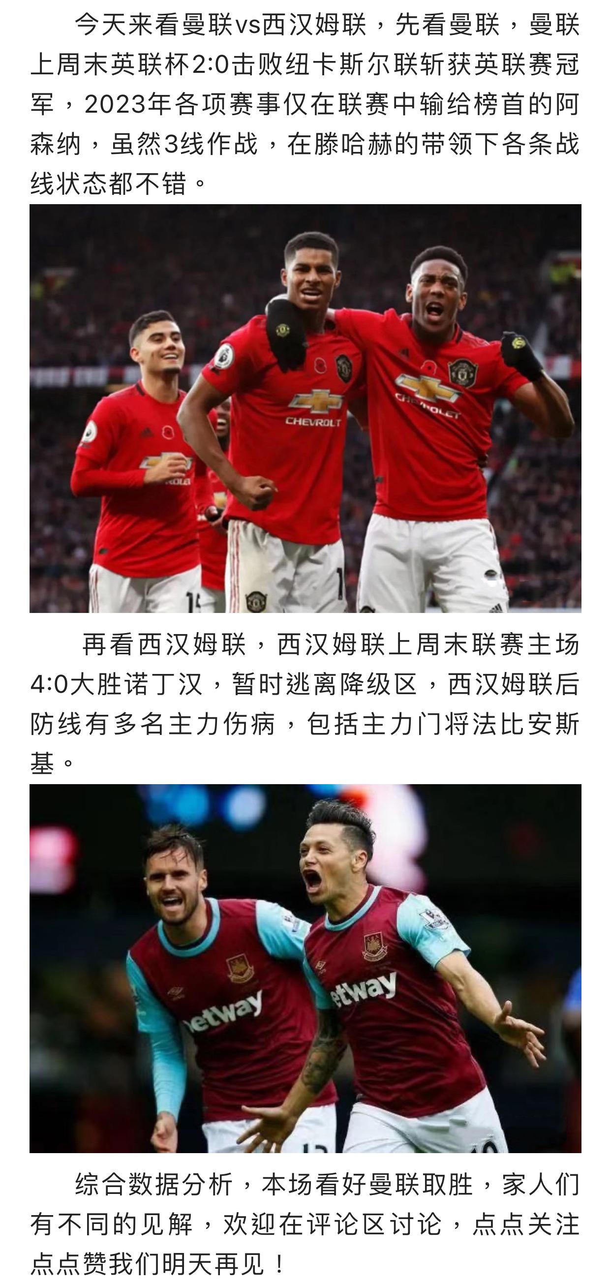 交锋往绩曼联占优: 历史上双方共有127次交锋记录,曼联60胜26平41负占据上风,进237球失165球。其中在主场曼联获得45胜6平14负的佳绩,进149球失62球。两队最近7次交锋曼联5胜2平保持不败,英超赛场最近11次交锋曼联10胜1平不败,西汉姆联队上一次在联赛中击败曼联还要追溯到2007年的12月29日。