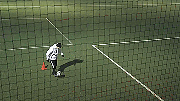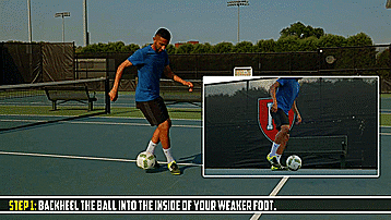 第一步:我们惯用脚用脚后跟将球磕到弱势脚的脚内侧。