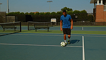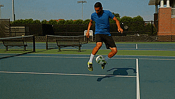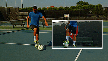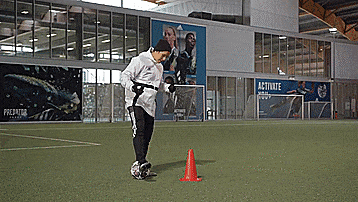 把脚放脚在球上开始,用向外环绕地球将球滚回朝向弱侧的膝盖,用我们的膝盖内侧把球拍向我们惯用的一侧,做一个膝盖AKKA。