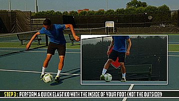 第三步:最后用脚内侧快速做一个牛尾巴(不是脚外侧),先向外推,然后快速将球拨向身体另一侧。