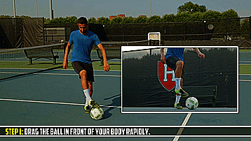 第二步:将球拉到身后,立刻用惯用脚从支撑腿后接球,并将球捞到身前。