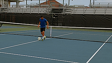 让球弹起,再用我们的弱势脚的内侧把球击向惯用的一侧,最后惯用脚进行凌空击球,把球踢到防守队员周围。