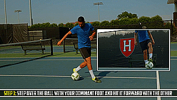 第一步:惯用脚从球上跨步,然后用另一只脚将球带到身前。
