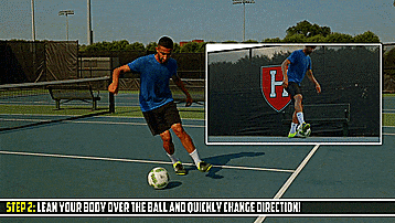 第二步:弱势脚将球磕出,身体随之向球倾斜,快速变向。