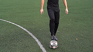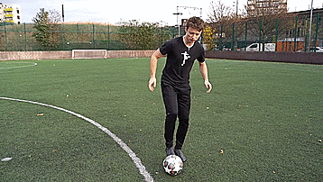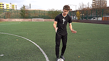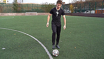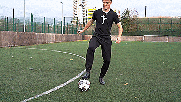 第二步是小腿触球,我们要做的是先把球拿在手里,我们要专注于这个动作,我们要把球抛出去,然后做向内踩单车,就像我们做环球地球起球一样,我们要把注意力集中在球上,把重心放在惯用脚上,抬起弱势腿并弯曲。