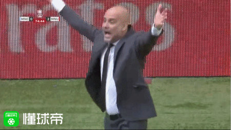曼城两球落后,瓜迪奥拉在场边情绪激动指挥。↓