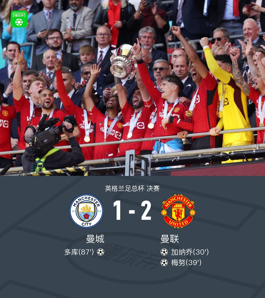 直播吧5月25日讯 北京时间5月25日晚22点整,2023-24赛季足总杯决赛在温布利大球场展开角逐,曼城对阵曼联。上半场格瓦迪奥尔与奥尔特加配合失误,加纳乔笑纳空门大礼,梅努扩大比分,下半场哈兰德中框&遭抱摔未判点,阿尔瓦雷斯失良机,多库破门难救主。最终曼联2-1复仇战胜曼城,曼联时隔8年再次夺得足总杯冠军,曼城无缘赛季双冠王。