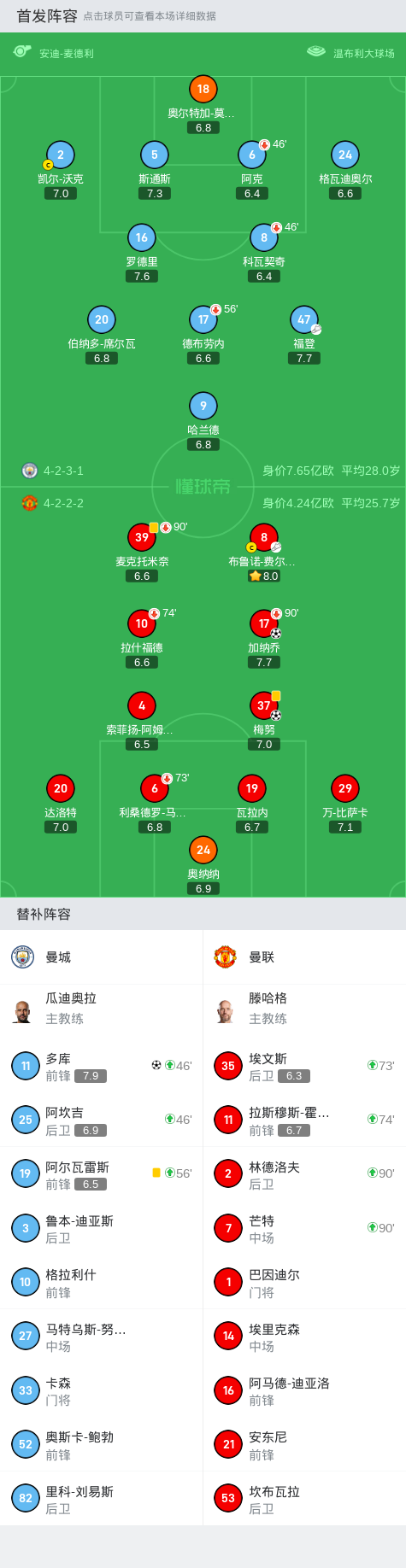 曼城出场阵容:18-奥尔特加、2-沃克、5-斯通斯、6-阿克(46’25-阿坎吉)、24-格瓦迪奥尔、16-罗德里、8-科瓦西奇(46’11-多库)、17-德布劳内(57’19-阿尔瓦雷斯)、20-B席、47-福登、9-哈兰德
