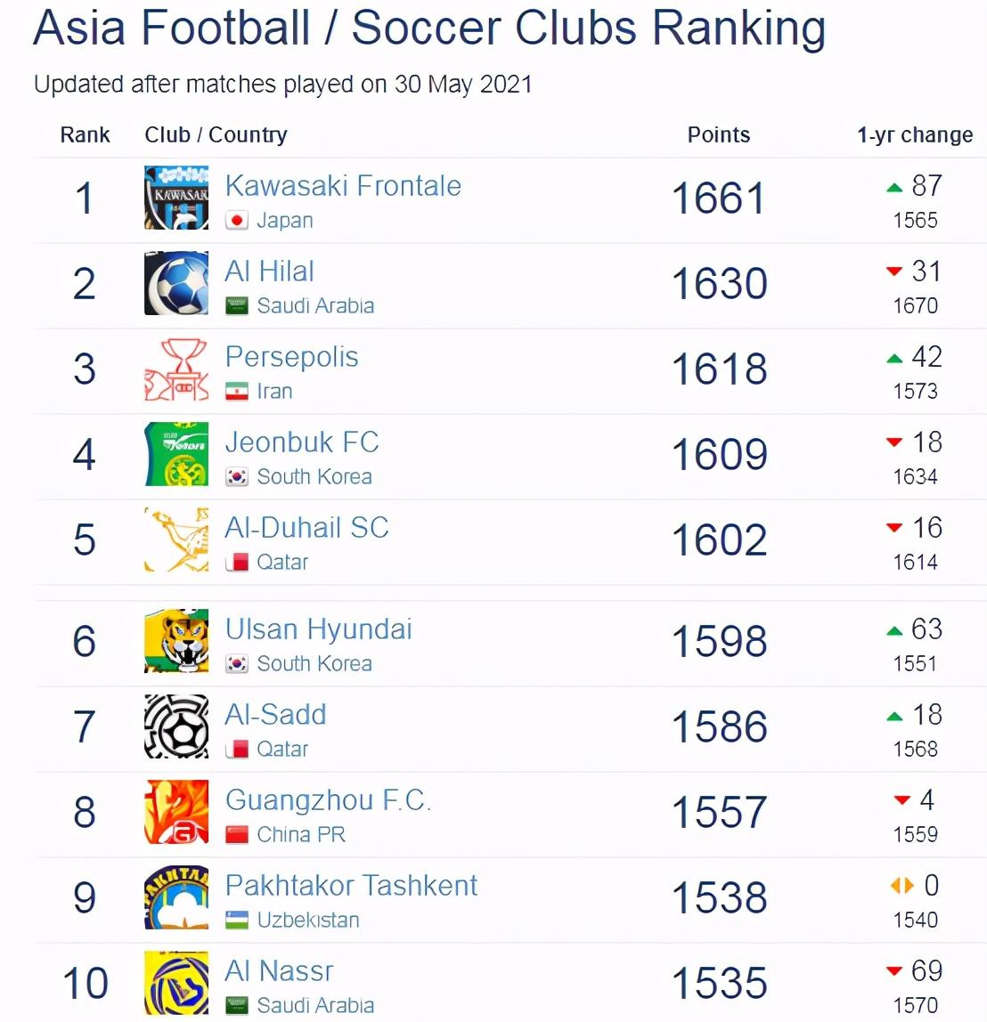 中国俱乐部方面,广州队排名亚洲第8,世界第167位。上海海港第11,世界排名第219位。北京国安第12,世界排名第220位。